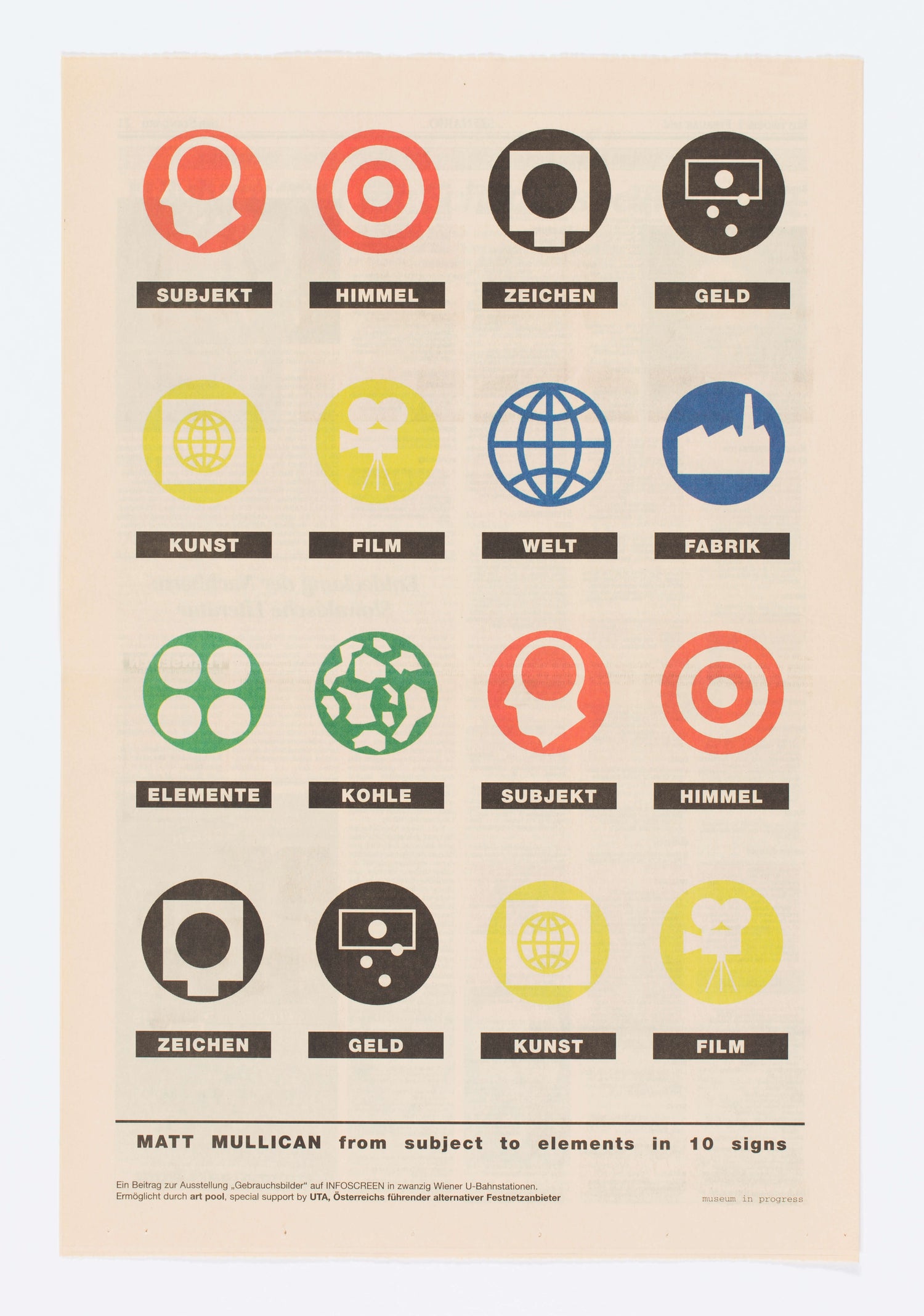 With the aim to connect contemporary art with every-day life, the unique art initiative museum in progress organises exhibitions not in common exhibition spaces. All projects take place in media such as newspapers and magazines, or in public space on the façades of buildings, on billboards and in concert halls.